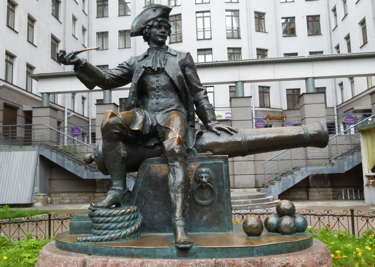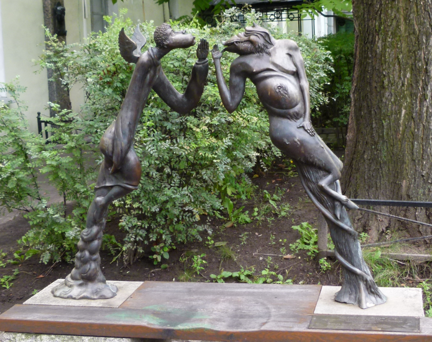 At University Embankment 11, I find a guarded entrance. I ask the guard, where the sculptures are that I have read about… and she answers: “yes, we are proud of them, I will show you the way.” She takes me into a nice garden. “Look, here is our begemot (hippo). Rub it, and you will get married.” Hm, no need to rub it, Ernst is in my heart. I take a photo… and the guard supports me to select the perspective. Look, here is the Petit Prince. And at the other end of the garden, there is Columbina… yes, she likes her garden and she likes to share it with visitors. And I find many more sculptures, also an angel and a devil.