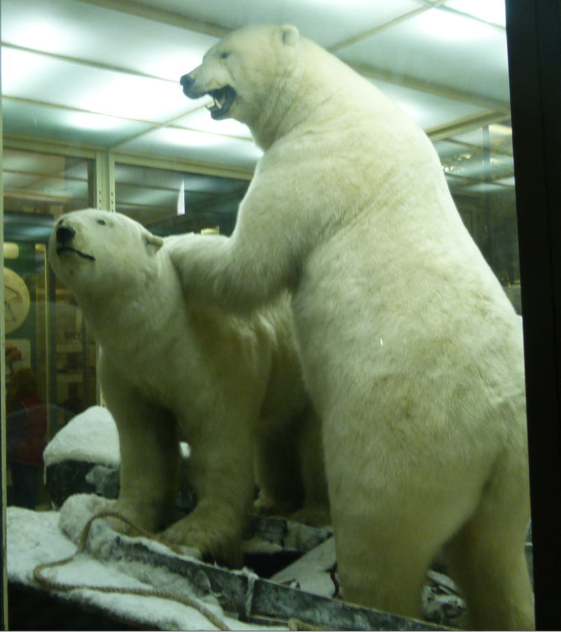 The entrance to the museum of zoology is a small door. Today the entrance is free. There is a huge hall with skeletons from dinosaurs and various fish. There are long gangways with a wealth of vitrines showing stuffed animals, set up in their natural environment. E. g. polar bears on (cardboard) ice and wooden boats. Or storks and eagles feeding their young waiting impatiently in the nest. Or wolfs in the steppe etc. And mammoths that come from the Siberian ice.