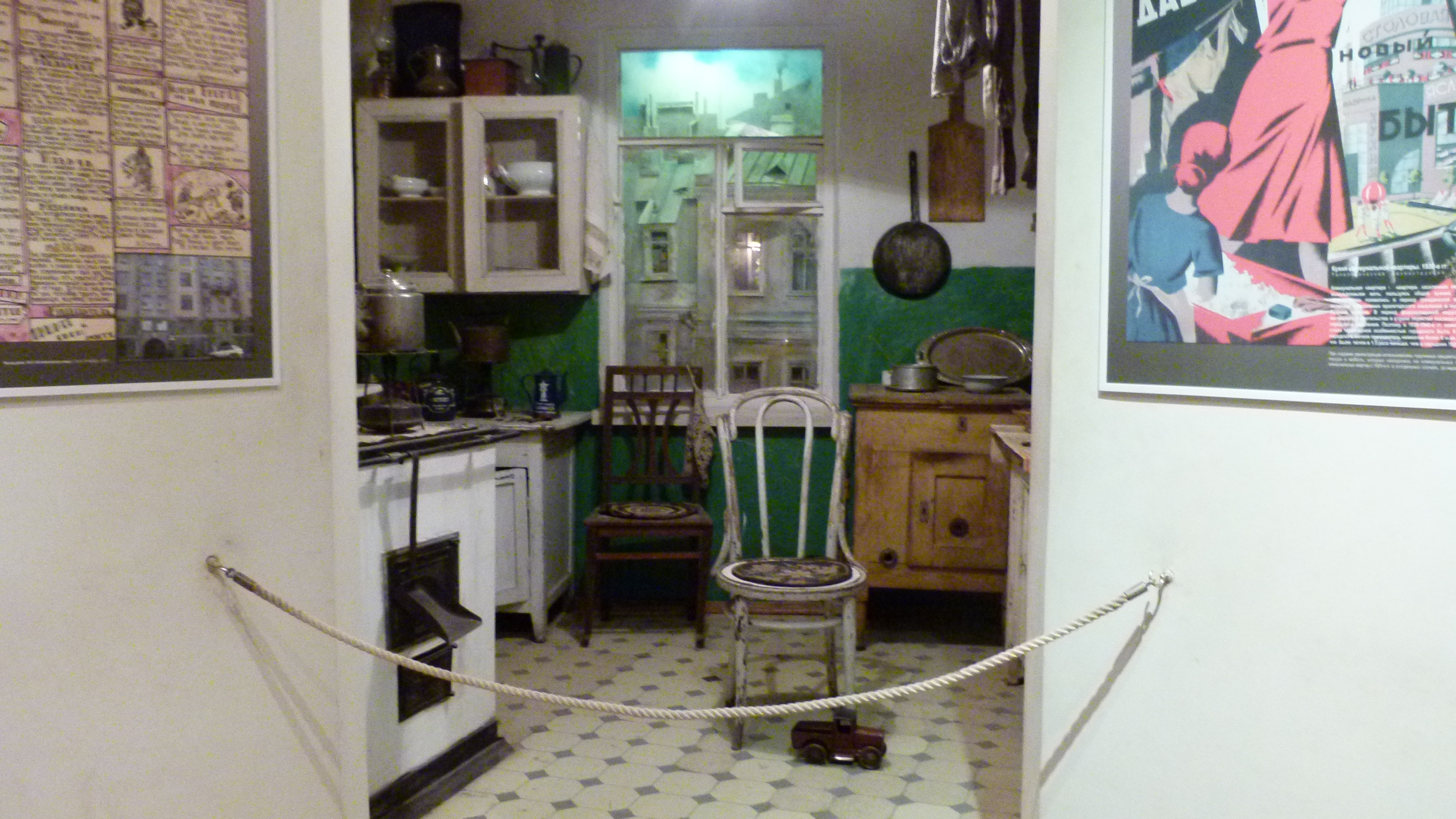 The museum of Russian politicial history is in the beautiful modern style Kshensinskaja palace not far from the Peter and Paul Fortress. My Lonely Planet tells me that Lenin gave speeches from the balcony of this palace. I agree with my guidebook – this museum is well curated and tells history from the Zars over the revolution, the Soviet times and the disintegration of the Soviet Union up to Jelzin, proving an objective attitude. I read about the Zars, watch Lenin’s revolution, then follow Stalin, study the five year plans and the advertisement of a kolchos (proudly announcing that they have electricity and radio – with huge loud speakers), the second world war, then Chruschtschow with the thawing period, followed by Breschnew (the Russians called him the Eyebrow Carrier or Бровеносиц). The museum also shows, how the people lived in the kommunalkas (коммуналки) – here is a sample of a kitchen shared by several families.