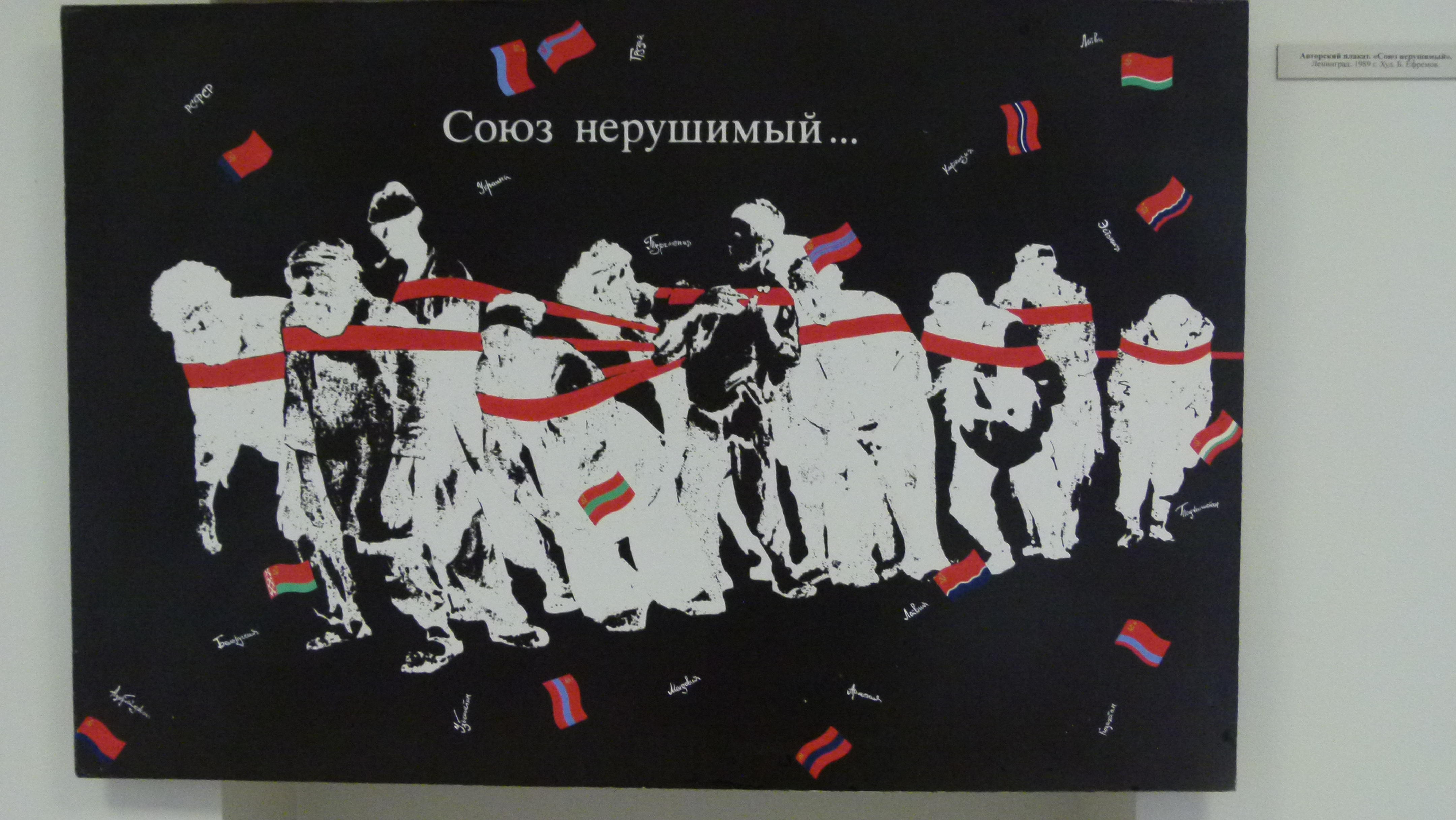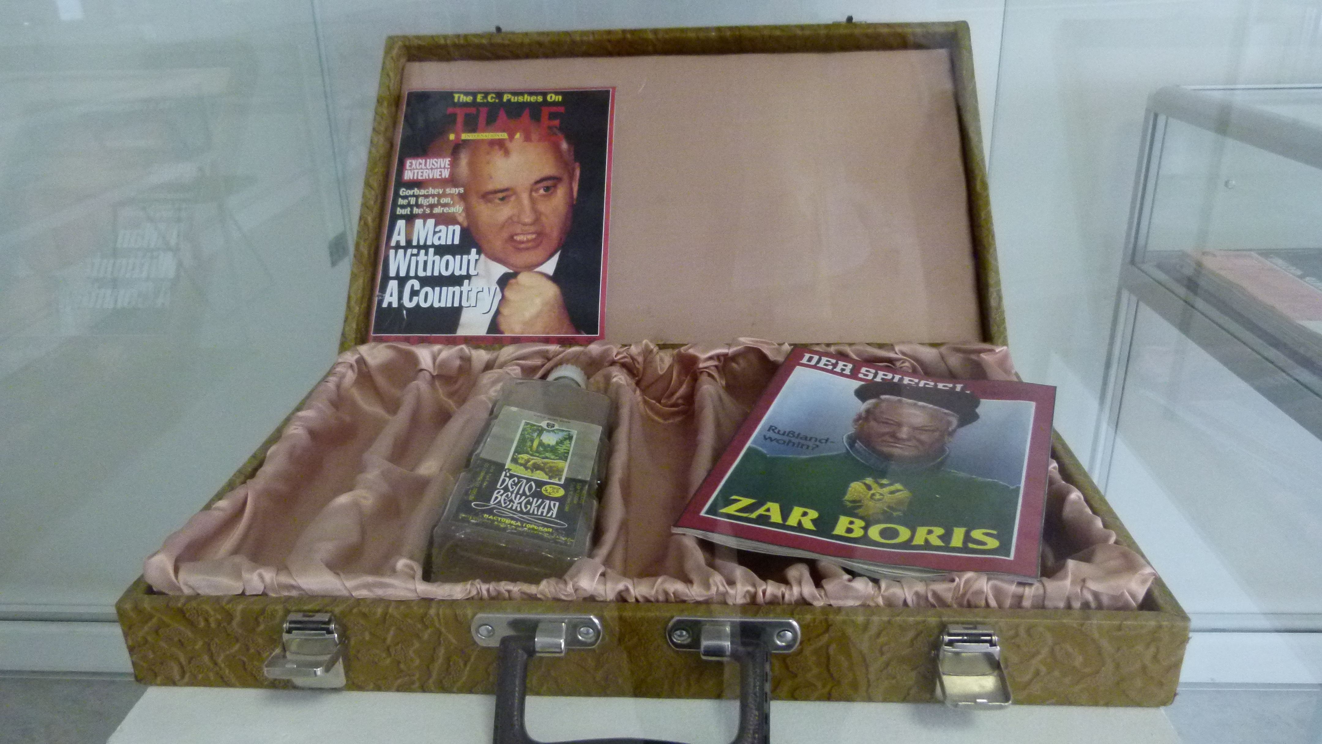 On the top flloor, I find the late 80’s and the 90’s. I am impressed, how the collapse of the Soviet Union is illustrated. There are caricatures and samples of Western newspapers like the Spiegel or the Economist, describing the events with critical headlines such as “a man without a country” or Jelzin at the chasm (Abgrund). And I find the allusion to Ilja Repin’s Wolga trawlers: Союз нерушимый or the union that cannot be broken.