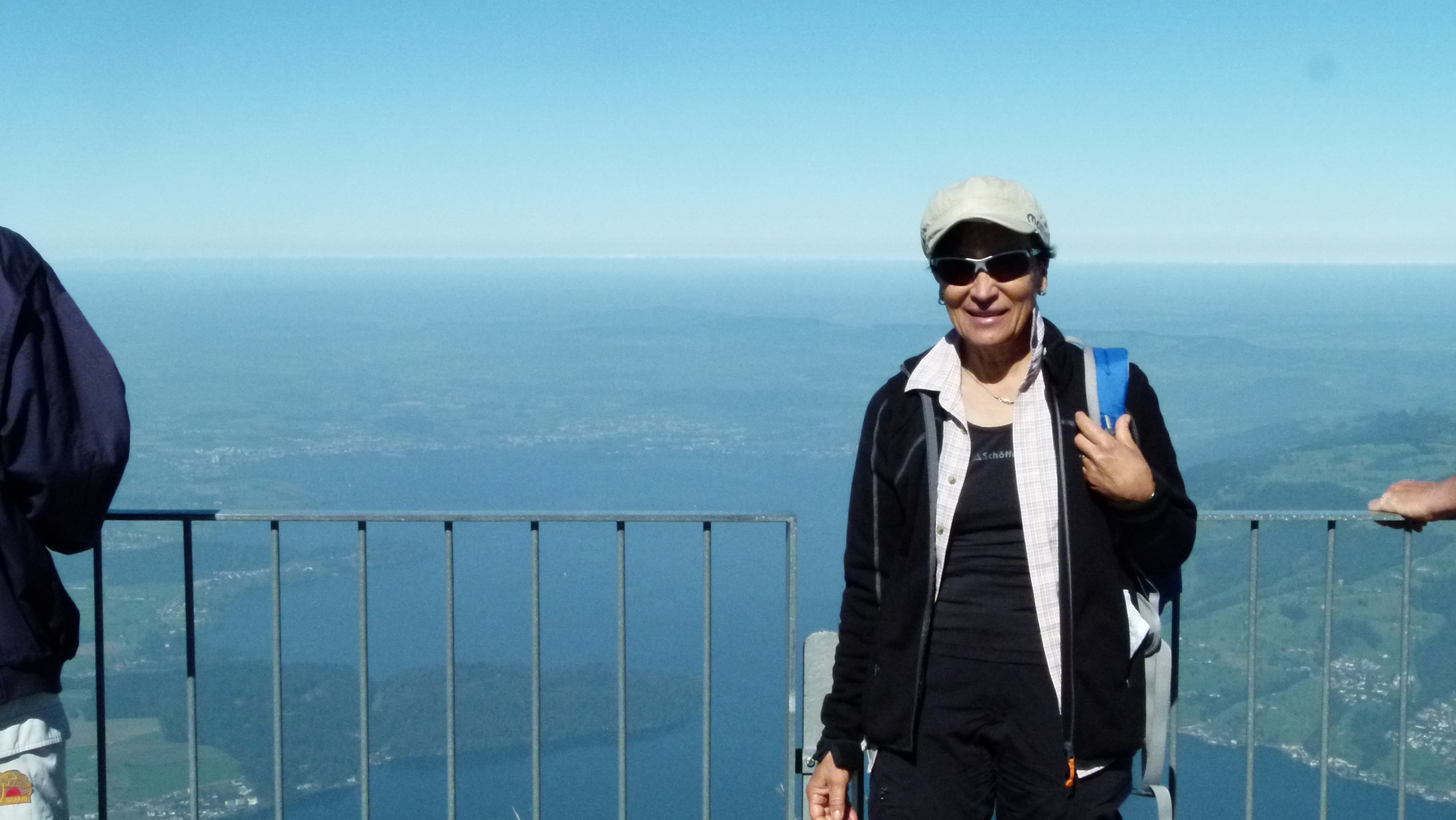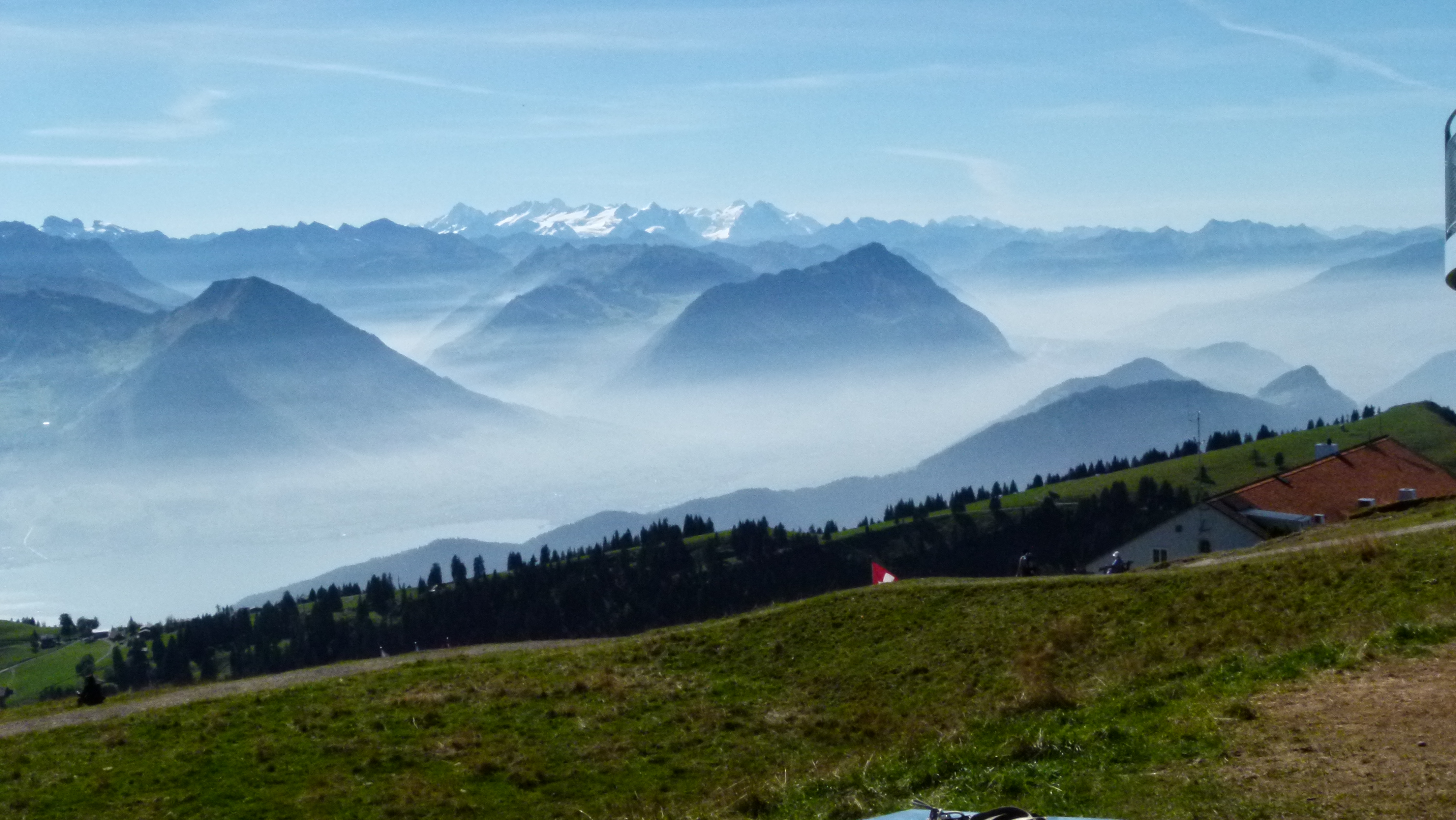 On the meadow above the steps we are at about 1000m and now above the fog. We enjoy the panorama… here is a picture with Pilatus and the Bürgenstock.