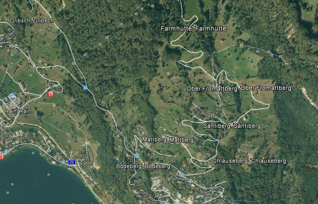The path between the ridge and the rails offers a great view of the Lake of Zug. This is where Mark Twain and his friend had been caught by rain and fog: “It came on to rain, and it rained in dead earnest… Next a smoky fog of clouds covered the whole region densely, and we took to the railway ties to keep from getting lost…. by and by, when the fog blew aside a little, we were treading the rampart of a precipice, and that our left elbows were projecting over a perfectly boundless and bottomless vacancy, we gasped and jumped back for the ties again.” Well, Mark Twain may have overstated the precipice somewhat.