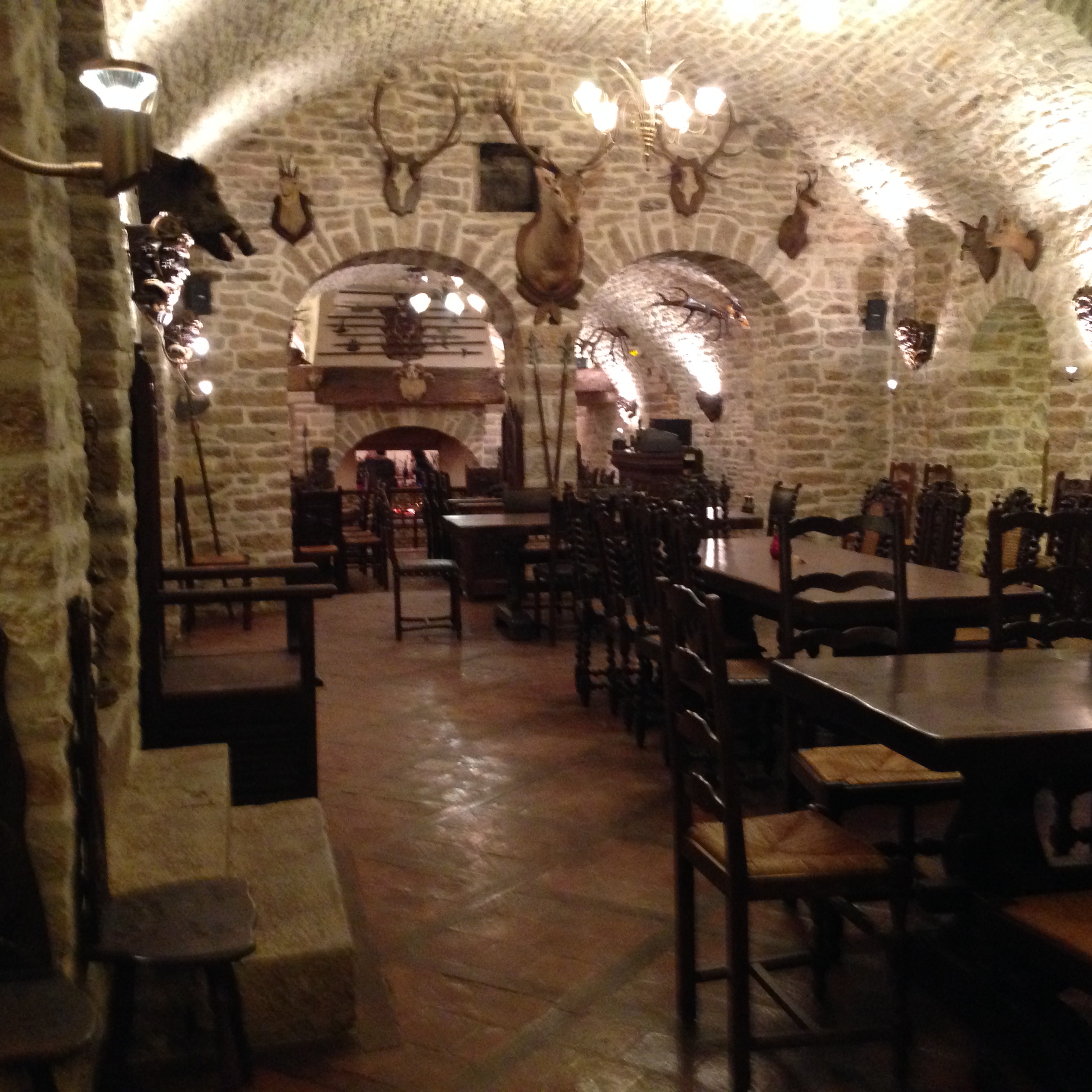 In La Rue des Halles we visit Leclerc, a winegrower that also owns a restaurant. In my opinion, the vaults are a somewhat kitschy with the stuffed animals and horns hanging on the walls.