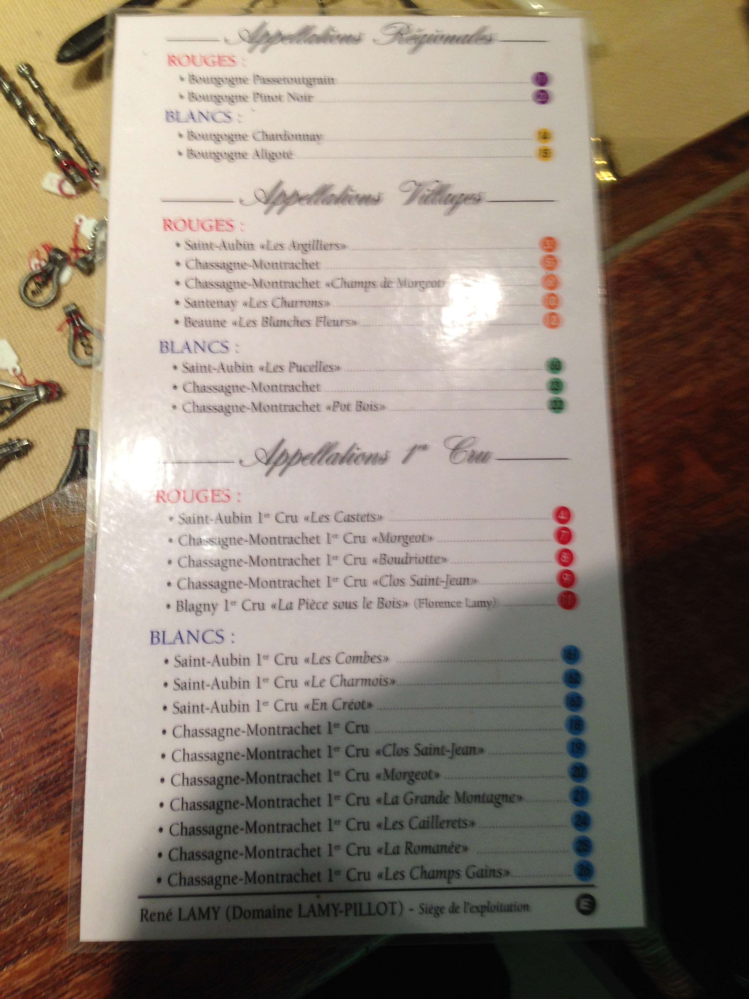 Larissa had recommended La Veuve Moroni. We find her in Puligny-Montrachet. She welcomes us in her plain tasting room and tells us that she has hosted a tasting of her wines with Coquilles Saint Jacques yesterday. She is a dynamic person full of entuhsiasm – her husband has died 30 years ago and she has continued the winegrowing business on her own. When I drink her wines at home, I prefer the red to the white.