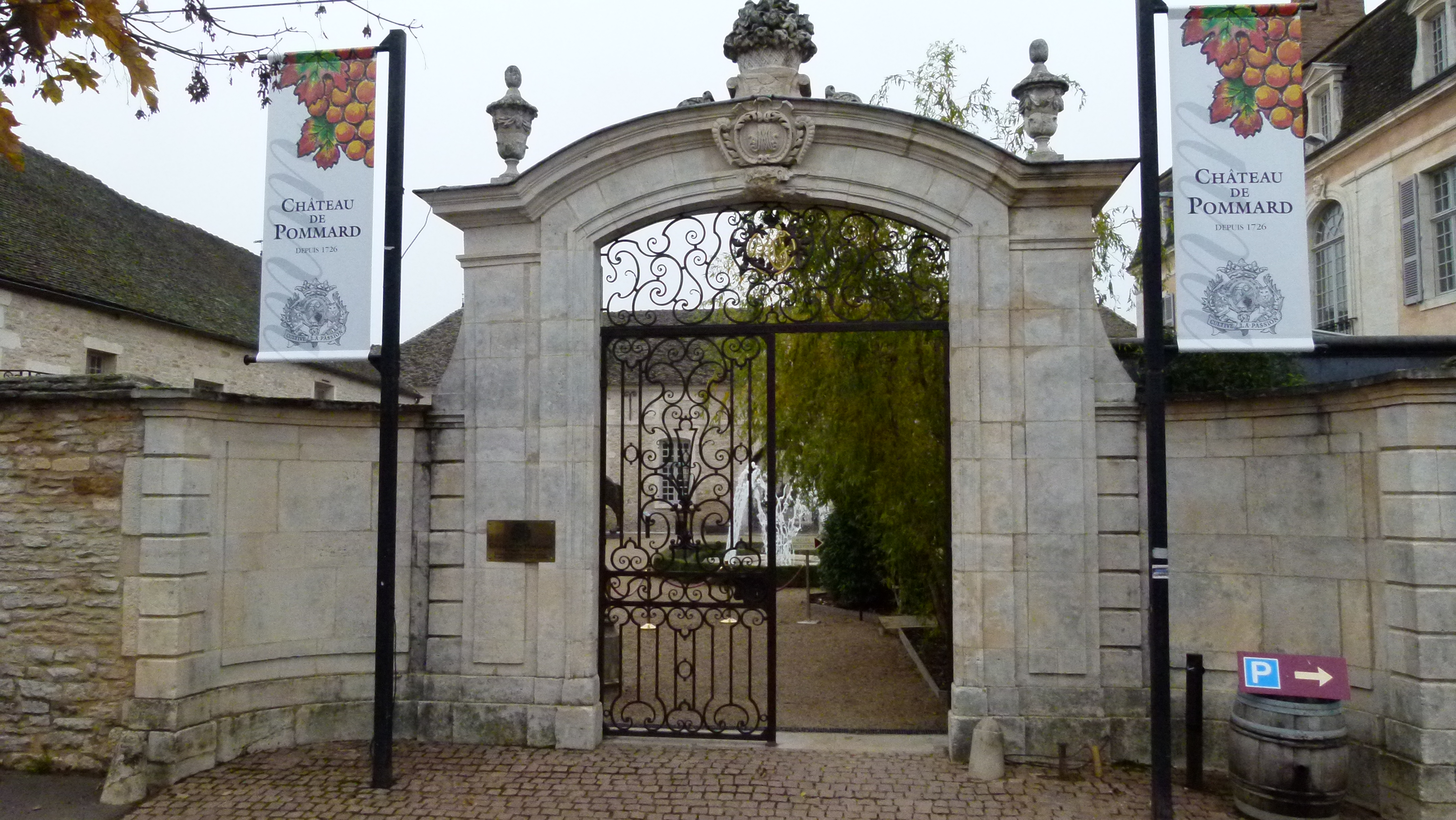 Château Pommard is a beautiful estate south of Beaune. The gate invites visitors to enter.