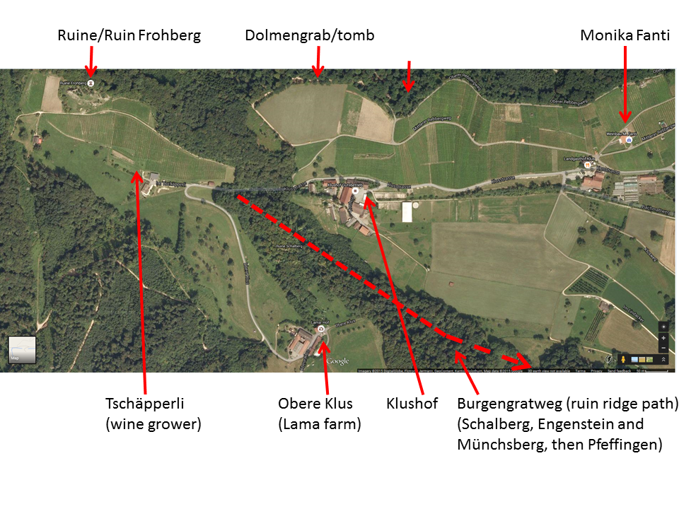 I like the Klus and check out the marked hiking paths and the more hidden unmarked paths to get ready to lead the Monday Nordic Walking group to the tomb and the castles. Thank you, Andreas and Helga, for uncovering the secrets of this valley to me.