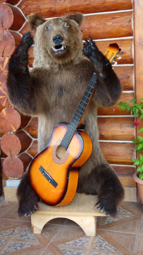We need another break and have coffee at the Coloçare, a restaurant that is run by a cousin of our policeman. He admires the owner, because he has constructed and decorated the place all by himself. With a lot of phantasy, as for instance the bear with the guitar shows.
