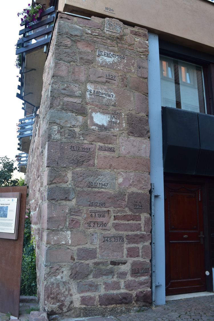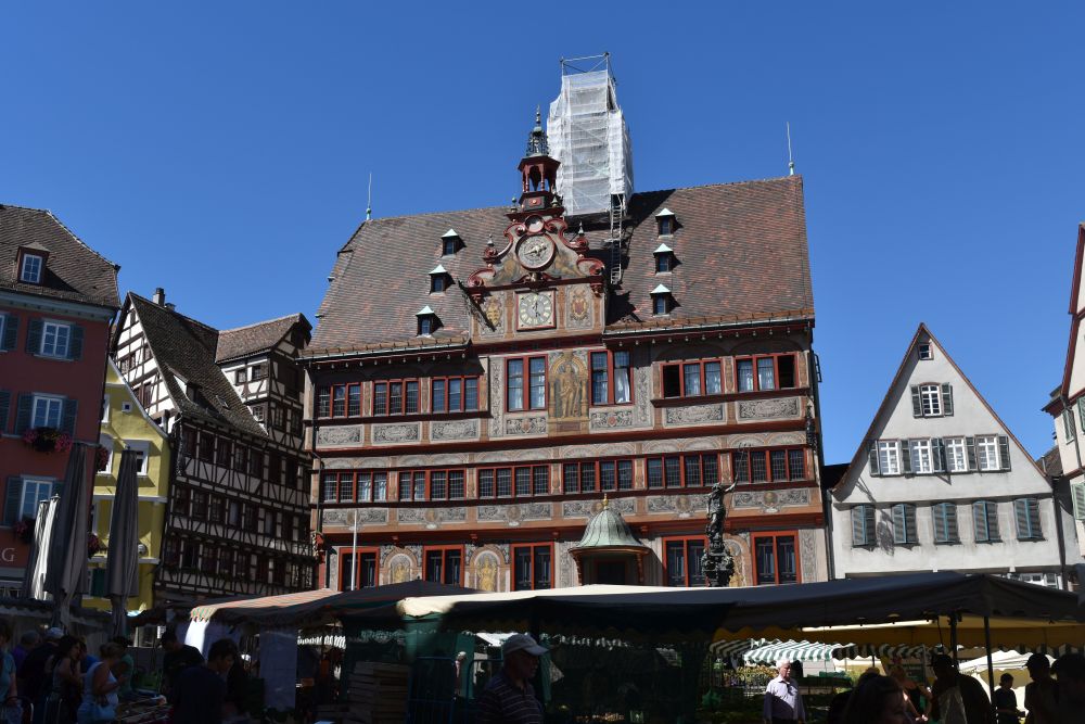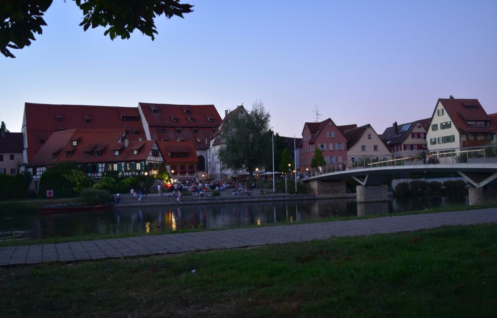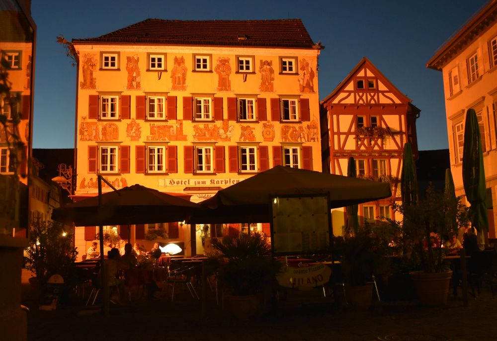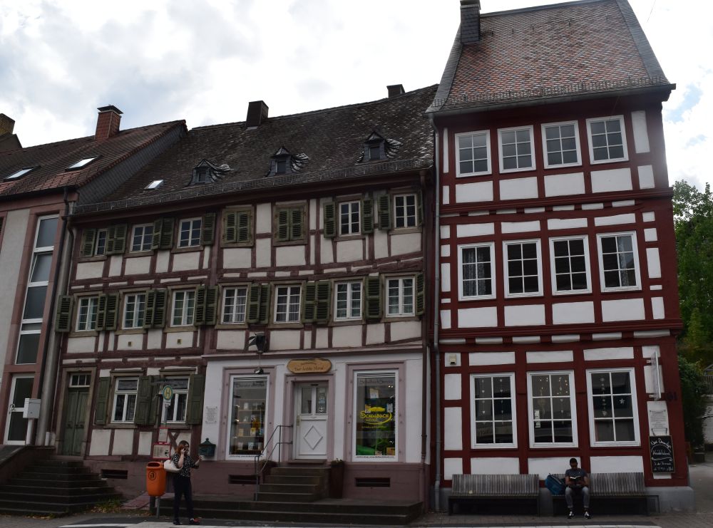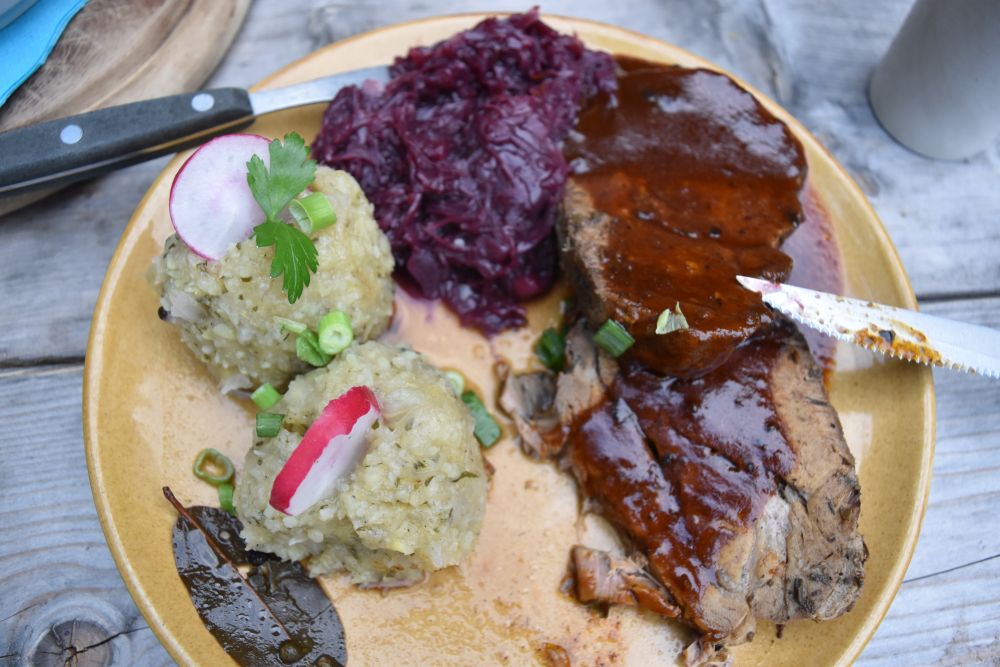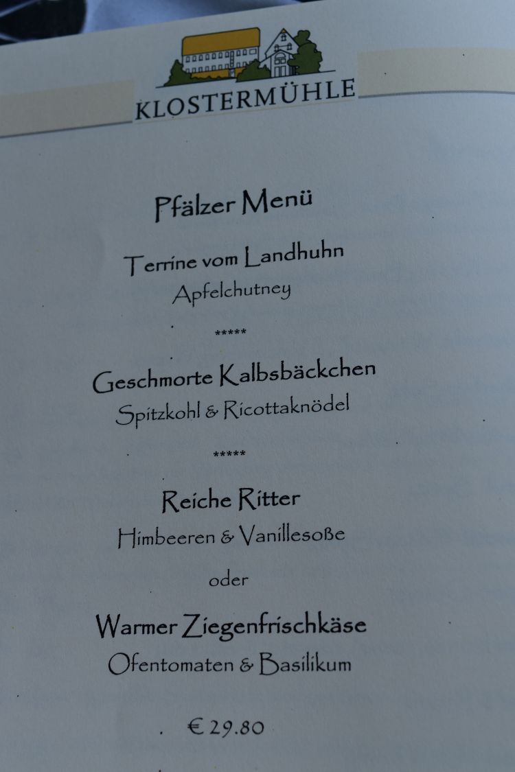 We settle in the courtyard. Ursula has a mixture of potatoes and apple baked with cheese – excellent. I enjoy roasted pork – also delicious. “Lasst es Euch wohl munden” (enjoy it well).