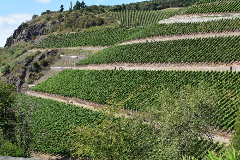 We drive along the Nahe to Oberhausen. We oscillate a bit, until we find the traditional winegrower Hermann Dönhoff in the Bahnhofstrasse. This winegrower, Johnson says, is perhaps Germany’s best. I expect a huge and representative tasting and selling area with a lot of staff working there. We find the wife of Dönhoff – she is under stress, as she is cooking a meal for guests that are expected to arrive soon. We find her husband in a rather modest selling and tasting area, also under stress, because he has promised to join his wife now. But, okay, he can sell me some Riesling. I buy two bottles of Grand Cru and a late harvest from Hermannsberg, the steepest and best rated vineyard in the Nahe region, just above a bent of the river. Mr. Dönhoff is proud of his wine, and when he hears me laugh about “Dellchen” (another name for a vineyard here, “little dent”), he mumbles something and disappears to fetch a description of his vineyards: “Look, this is for you, as your are interested”… But now, he absolutely has to join his wife and receive the guests – the phone is ringing angrily.