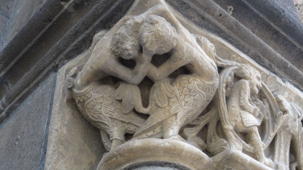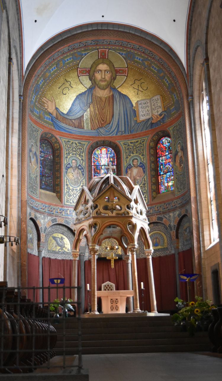 Next door in the church of the Dominican monastery we find Martin Schongauer’s Madonna in Rose Garden (Madonna im Rosenhag) from 1473. Illustrations in the church show that the painting of the Madonna has been cut off on all four sides. It is now surrounded by the neogothic frame. Originally she sits in a beautiful garden with flowers and Godfather above her – a romantic atmosphere.