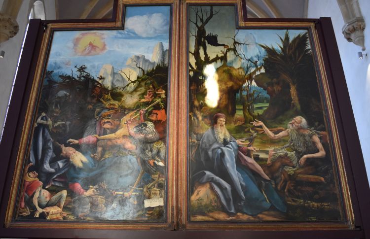 The altar has been painted by Matthias Grünewald in 1515. It was the Antonian monks of Issenheim (not far from Colmar) who had ordered it. The altar centers around Saint Antonius, an Egyptian hermit of the 3rd century (Daniel Koniezka: “Le rétable d’ Issenheim – l’histoire d’un tableau magique”, Editions Artlys 2015 and “Kostbarkeiten aus dem Colmarer Unterlindenmuseum, Christopherus Verlag, 1964). The relics of Antonius were used in the 11th century to mitigate the symptoms of the so called “Antonius fire” caused by the ergot in the grain (“Mutterkorn” in German, it is a toxic mushroom). The Antonian monks run hospitals for the people suffering from the Antonius fire and one of these hospitals was attached to the monastery of Issenheim. The monastery flourished in the 15th century and ordered the altar. To my opinion the most impressive paintings of the altar shows the temptations of the hermit Antonius. Demons try to distract Antonius from his belief, but he calmly continues to trust in God (with his white hair and blue coat he lies in the middle of the left panel). The demons show signs of the Antonius fire (such as the limbs becoming black – “burning” – and falling off). I had seen this altar before in the 1970’s and I remembered the temptations of Antonius – for more than 40 years I could not forget these demons and the serene face of Antonius.