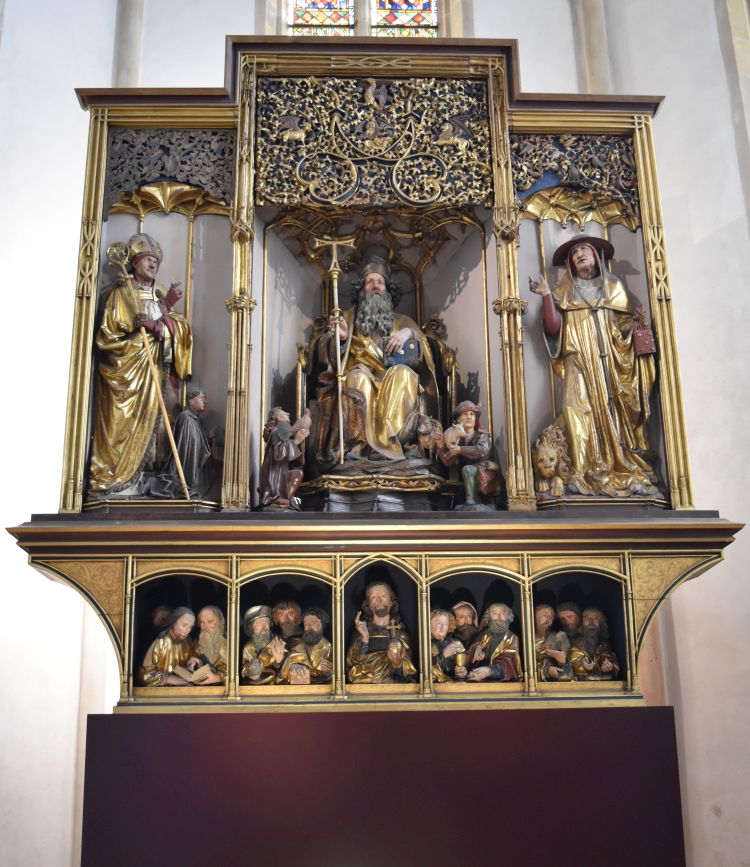When opened completely, these sculptures appear (made by Niklaus von Hagenau). Saint Antonius sits in the middle with Augustinus to his left and Hieronmymus to his right. At the bottom the twelve apostles are surrounding Christ.
