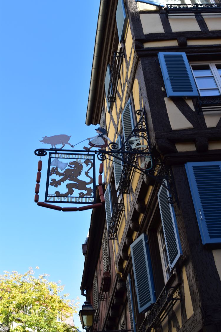 After all that culture we stroll through the pretty small streets of Colmar with their half-timbered houses. I like this girl chasing the pig…