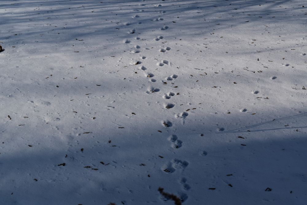 The small nature reserve lakes are frozen and covered with snow that are decorated by animal tracks.