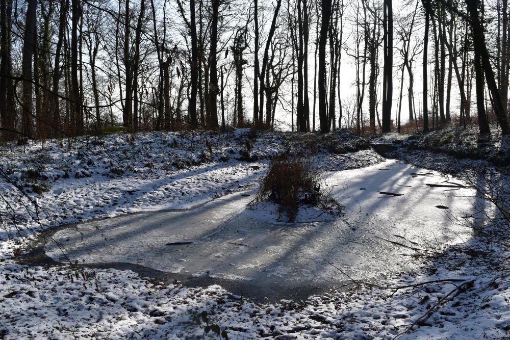 The pond near the monument of Oser is covered with ice and the sun plays with the trees.