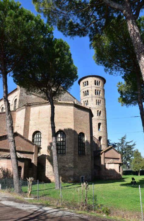 Yes, the older of the two basilicas named after Saint Apollinaris is called “Nuovo”. This is the view from outside. The bell tower is round with the typical double and triple windows. The narthex has been added later.