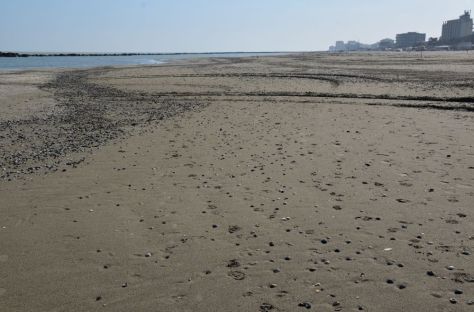 Then we drive to the Lidos or the beaches south of Ravenna. They are empty, empty and just empty. One lonely man is raking the sand. If he continues at that speed, he will never complete his work until Easter in about four weeks, when the first guests are expected and the beaches start to fill up with lines of arm chairs and umbrellas. I cannot imagine the crowd looking at this empty sand beach.