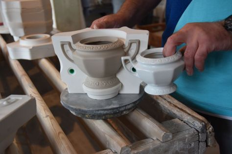 For more complicated vessels such as this sugar bowl, liquid raw material is casted into a plaster mold. The sugar bowl forms itself near the plaster and when thick enough, the liquid in the middle is poured out and the bowl remains inside. I can hardly believe that this works.
