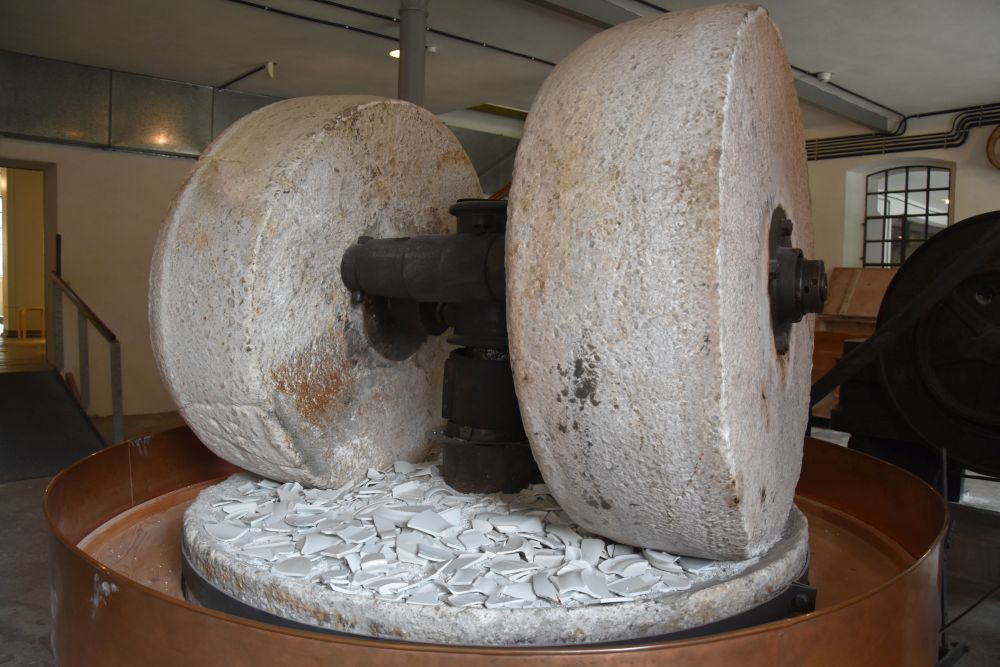 The production of porcelain starts with blocks of stone that have to be crushed in several consecutive steps, a process that starts with huge millstones.