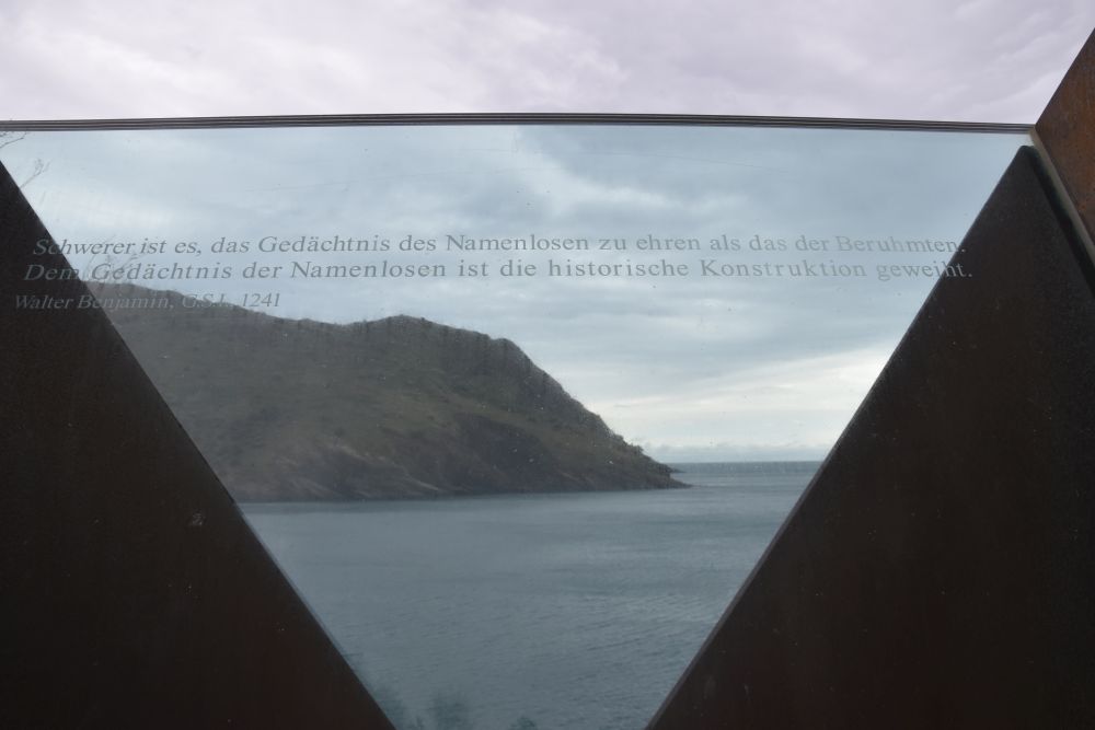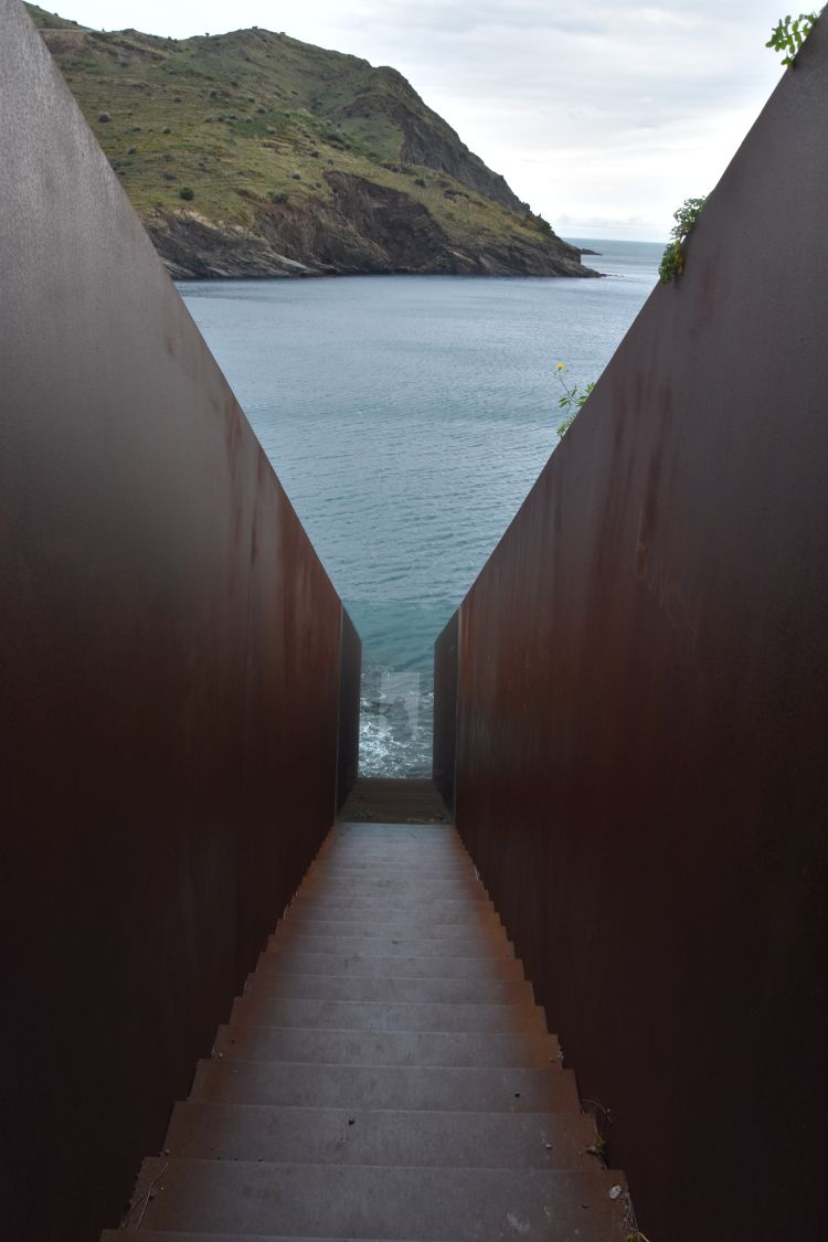 Portbou was the scene of the dramatic death of the German Jewish philosopher Walter Benjamin in autumn 1940. We stopped in Portbou to commerate him. Walter Benjamin succeeded in crossing the border from France to Franconian Spain. He and a group of Jews intended to travel on to Lissabon and then to the US. But Franconian Spain had just changed the law and would not let the group continue to Lissabon without a valid confirmation that they were allowed to leave France. Which, of course, they did not have. Benjamin committed suicide, and the rest of the group could then travel on to Lissabon. This monument called Passatges reminds us of that drama: Stairs lead into the sea.