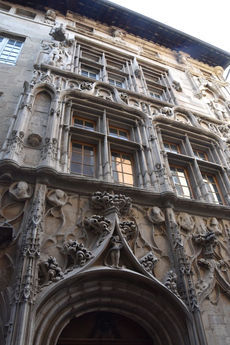 The House of Heads or La Maison de Têtes has been built by a university professor in 1530, as a plate explains. Its style is characteristic for the transition from late gotic to renaissance.