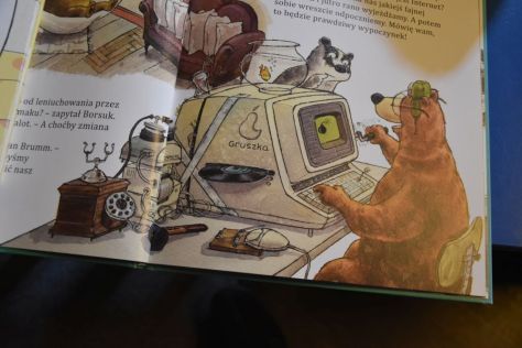 I love the bookshop „De Revolutionibus“ in Bracka. It has a wonderful corner with books for children. For the children of my friends, I buy two books about Pan Brumm and his friends. One book tells about Brumm celebrating Christmas and the other about him travelling to Hawaii. My favourite picture: Brumm sits in front of a computer branded „pear“ (gruszka) that says hello to the world via a telephone modem. And look at the mouse caught in the trap…