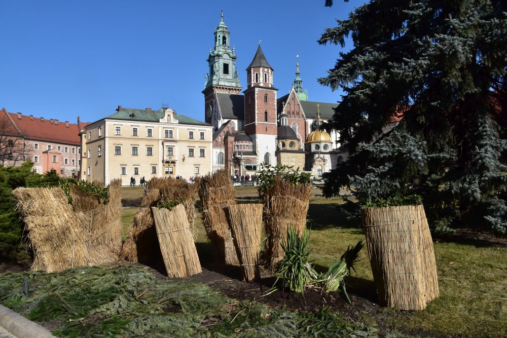A rose bush stands in the garden, wrapped up in straw to be protected against frost and winter – perhaps like these bushes on the Wawel castle hill.