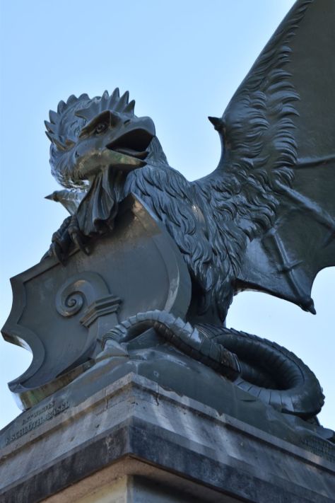 This is a very local topic. For the Wettsteinbrücke, an artist created four basilisks, now only one is left here, two are somewhere else in Basel and one is in Meggen near Lucerne. The Höibärgler want that the other three basilisks return to their original places at the Wettsteinbrücke. This is the one Basilisk that was allowed to stay at the entrance to the Wettsteinbrücke.
