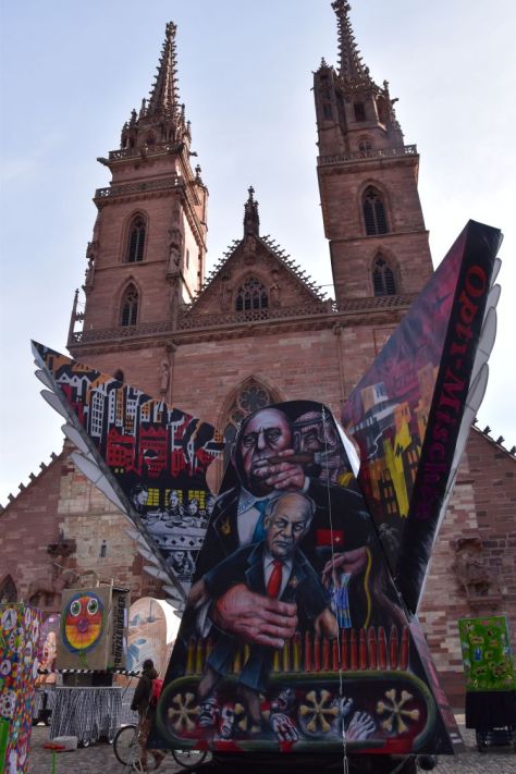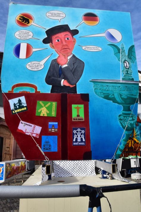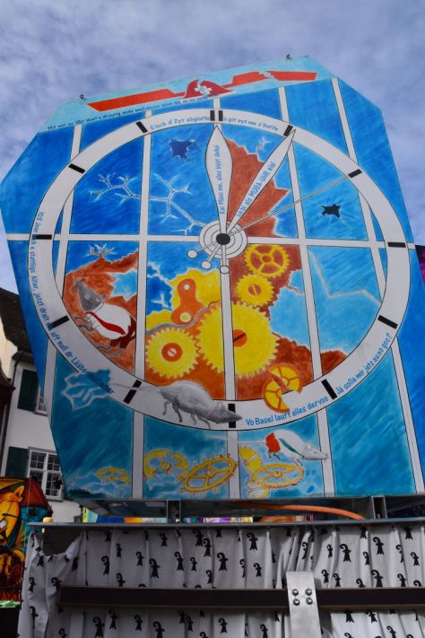 Basler Fasnacht (the Basel Carnival) takes place pretty late this year (2019). It started on Monday, March 11th, at 4 am (Morgestraich). Monday and Wednesday afternoon, there was the Cortège (parade), when the Clique (carnival groups) show their Sujets (topics) and the Waggis (seem to be farmers from the Alsace) distribute gifts and Räppli (confetti). The costumes, lanterns and other requisites illustrate the topics selected by the groups.