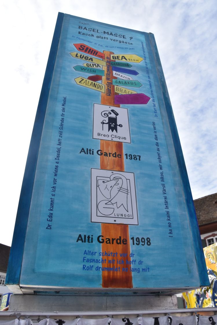 The Muba (Mustermesse Basel or Basel trade fair) opened their gates in spring 1917. When we needed a new refrigerator, a new piece of furniture or some wine, up to the late 80-ies we always did a research at the spring Muba fair and we benefited from the Muba discount. But since then the Muba has lost more and more visitors, perhaps also due to the internet. Now this year, in spring 2019, the last Muba took place and then closed its doors for ever. This was a major topic at this year’s carnival. The Blaggedde (carnival badge) shows the well-known clock of the Muba building alluding to the Muba closing down and the carnival lasting until closing down on Thursday at 4 am (“Ändstraich” or final stroke), when the road sweeper cleans the streets of Basel.