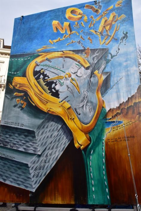 The Lälli Clique feels sad about the “Tempi Passati” (past times) and paint the melting Muba clock on one of the huge exhibition halls – like Dali’s soft watches. On the watch the verse says: “E grosse Bau, an dr Mäss kai Lüt – das Krüz trait au e Kirche hüt” (“A huge building, no people at the fair – this cross is also affecting the church”; “Mäss” means both trade fair and church mass and hence “Mäss” is reused for the mass in the church, where there are also less people now).