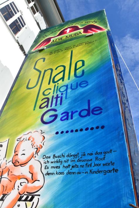 The verses on the rolling stone lantern are: “Dr Baschi – sträng und ganz bestimmt: “Ass jo ekain my Tesla nimmt” (“Baschi says severely and clearly: Nobody to steal my Tesla”; the head of the police department, called “Baschi”, acquired Tesla cars for the police of Basel). More verses: “Wär in dr Schwyz en Auti faart, ghört bald scho zuenere gschützten Art” (“those who still drive a car in Switzerland, will soon belong to a protected species”). And: