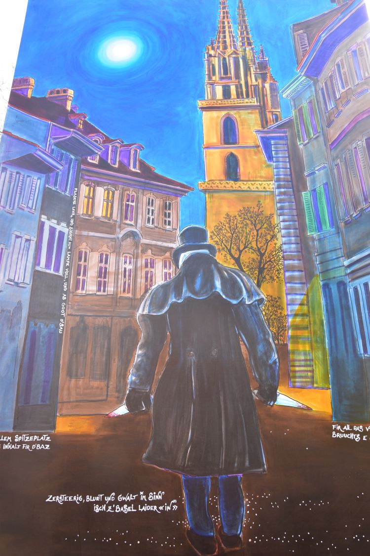 Last summer, the TV criminal story series “Tatort” took place in Basel. The Spezi-Clique Stamm take this up with the lantern that shows the city center. In one of their verses, they play with words: In German you can understand “Tatort” as a “site of crime” or as a “site of action”: “Bim Roothuus froog ich mii, ka das iberhaupt e Tatort sy” (“about the townhall I ask myself, whether this can be a site of action at all” (translating “Tatort” primarily as “action” and not as “crime”, indicating that the town council may not be too active).