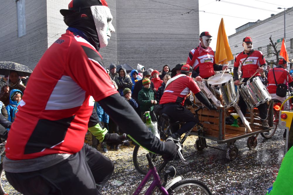 In the Cortège (parade), one guy sat on top of this rolling stone and the whole group was on wheels. Some painted signs for “bicycles only” on to the pavement.