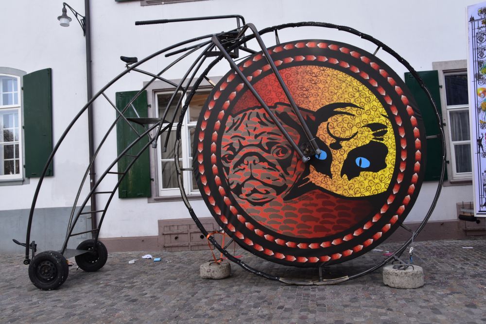Already at the Morgestraich, after 4 am on Monday, I noticed the rolling wheel of the Alti Stainlemer moving forward in the dark. It is their “rolling stone”. This may be a punch, as the name of the Clique (carnival group) “Alti Stainlemer” contains the word “Stein” or “stone”.