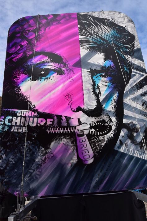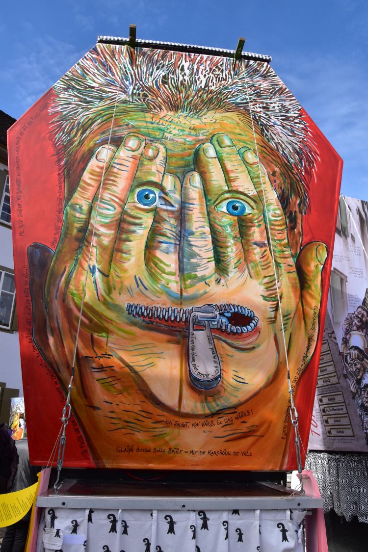 The carnival group D’Gniesser had the same idea, a face with a zipper. They say: “Kai Sujet, kai Värs, so das wärs” (no theme, no verse, well that’s it) and “#kai Sujet, syg gescheit, sag nüt (#no theme, be clever, do not say anything)”. The name of the group “D’Gniesser” can be translated as “the ones who enjoy it”.