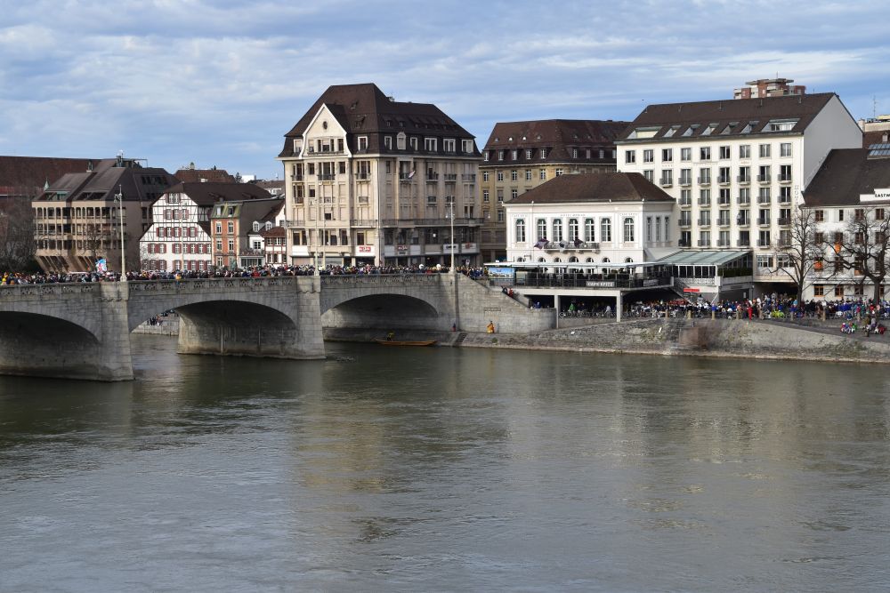 After the lantern exhibition I slender through the narrow streets of Basel. From the terrace of the Old University (founded in 1460), I can see many, many people on the “Mittlere Brücke” (middle bridge) and along the Rhine. They are not only from Basel, but also from many other countries. They enjoy our carnival which plays the role of a jester.