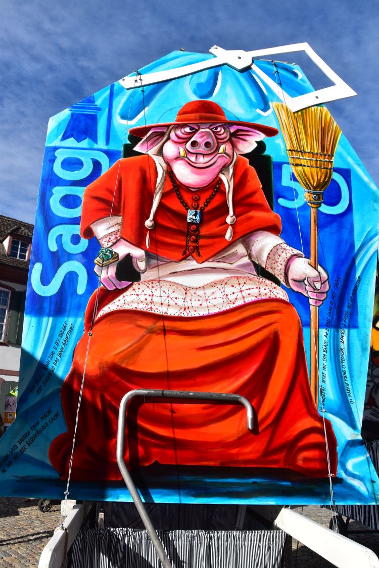 Another carnival group is called “Seibi” which is the colloquial name for the Barfüsserplatz, where pigs (“Säu” or in the older Basel dialect “Sei”) were traded in medieval times. The German word “säubern” (“säubere” in Swiss German) means “to clean”. “Säubere” has been split into “säu…bere”, and “Säu” are pigs in Swiss German (in German: (“Säue”). “Seibi” and “säu…bern” are perfect plays on words: The “Seibi” group has selected pigs to clean the Basel carnival: “Mir Säu…bere d’Fasnacht.” They allude to censorship, but also to other issues that might need cleaning.