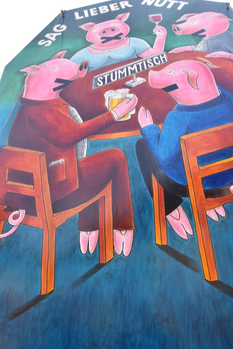 On this lantern, the pigs sit around a table with their mouths sealed up. “Sag lieber nütt – Stummtisch (Do not say anything – silent table)”. This is a play on words: stumm=silent, Stammtisch=regulars’ table; At the “Stamm-Tisch” the regular guests discuss politics and life over some glasses of beer, but due to censorship this table has become the “Stumm-Tisch” – by replacing the “a” by the “u“, “Stamm” turns into “Stumm” and “Stammtisch” into “Stummtisch” – with all regulars sitting silently around the table.