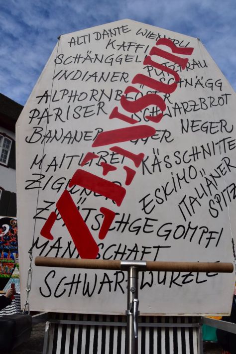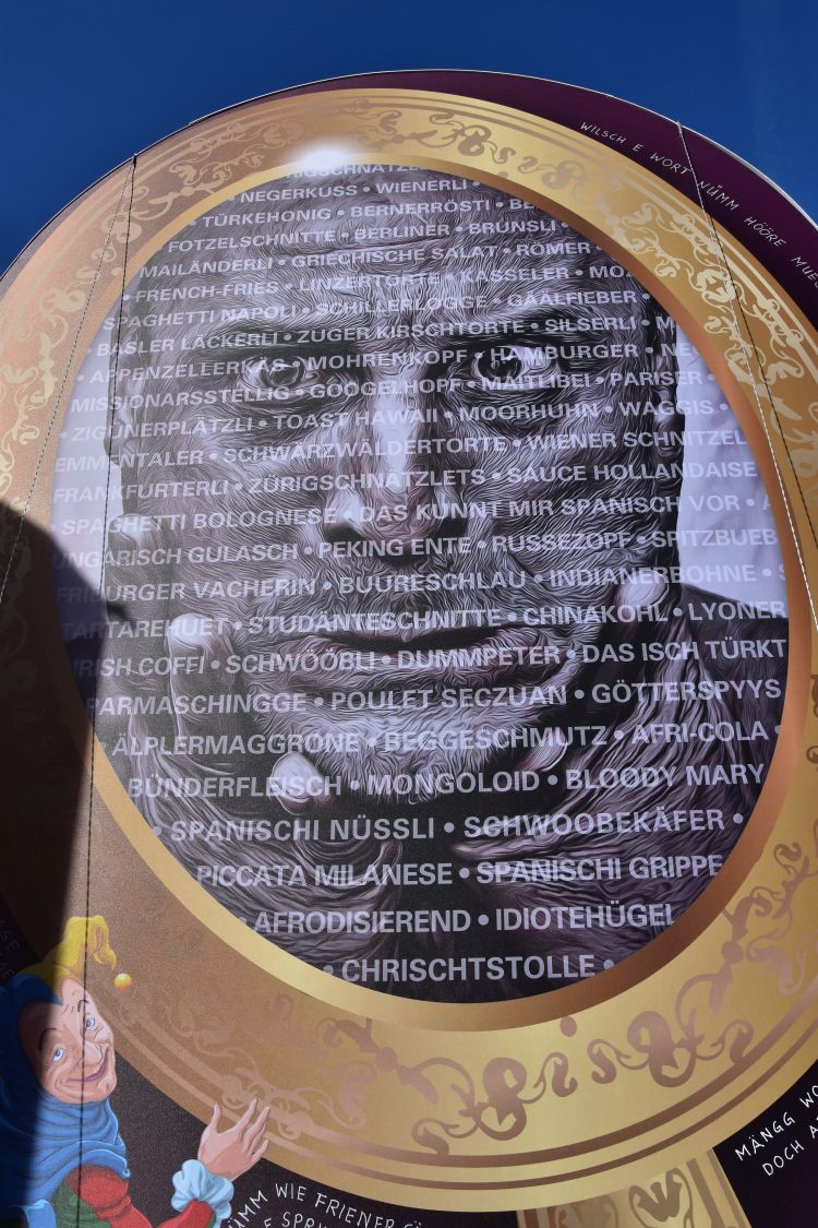 One of the verses on this lantern says: “Duesch aimol eppis lätzes saage, denn muesch grad e Muulkoorb draage. Jetzt miemmer unsri Sprooch uusmischte, sunscht lande mer no in dr Kischte. Dr politisch Drugg isch aifach zgross, drum heisst s jetzt Negro Freyi Strooss (If you say something wrong once, you have to take a muzzle. Now we have to clear up our language, otherwise we will end up in prison. The political pressure is simply too high, therefore we now say Negro Freyi Strooss”; meaning the carnival group is to be renamed from Rhygass to Freyi Strooss, as Freyi Strooss (Freie Strasse) is a much better address than Rhygass (Rheingasse) – hence the term “Rhygass” may be discriminating).