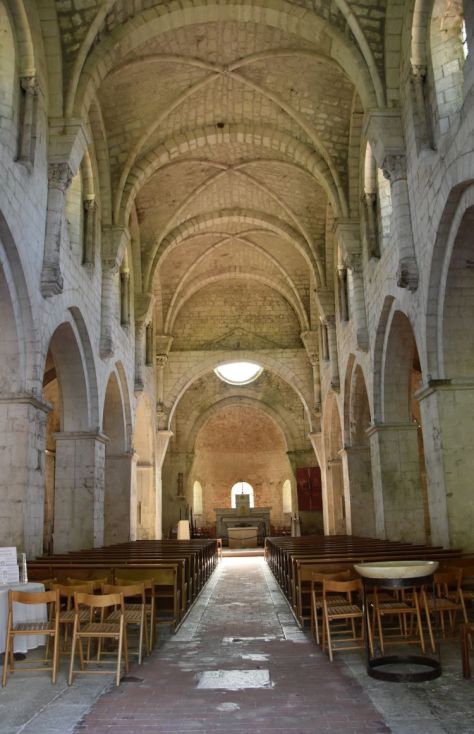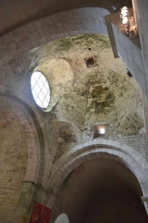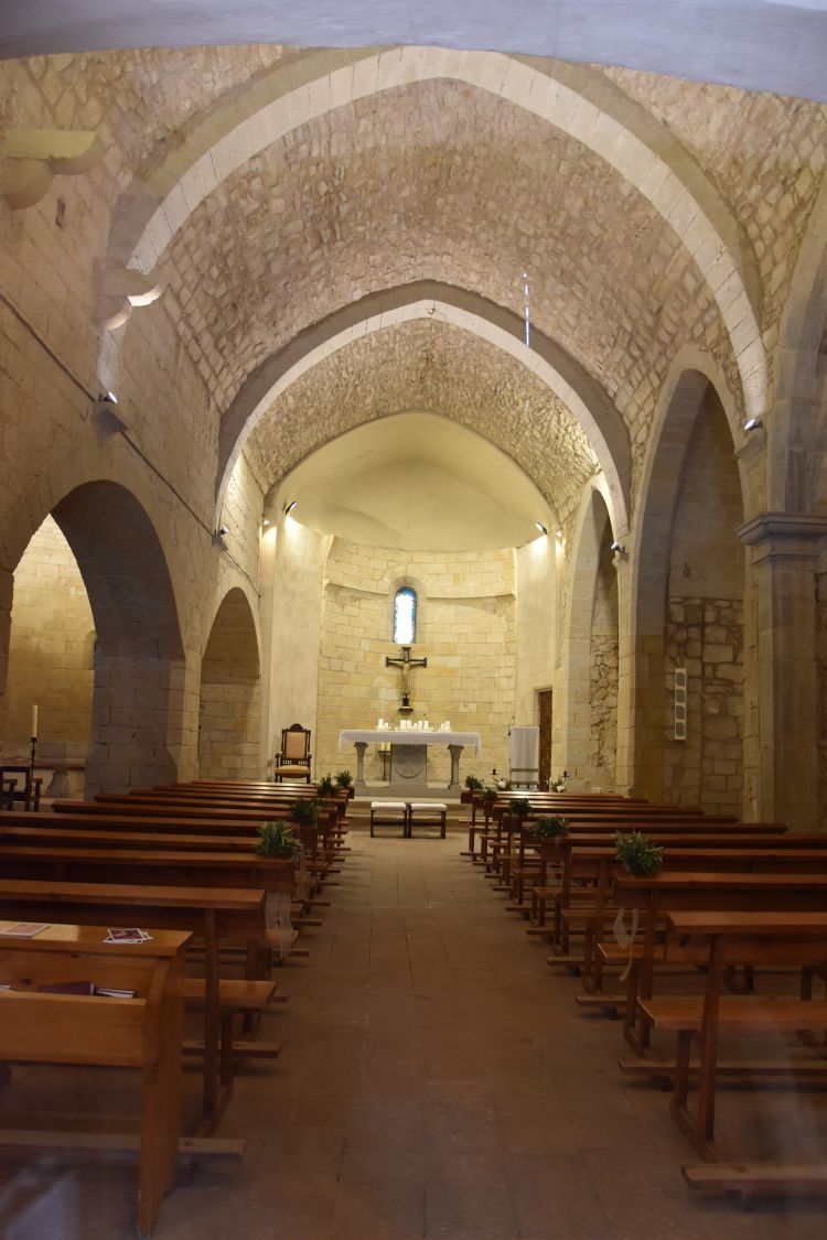 As it is typical for the Cistercians, the church is sober inside. Five ribbed vaults in the nave. Some adornments on the chapters of the columns. The oculus above the choir symbolizes God. Or, as the panel in the church says, it is to remind us that we adore one single God. The arch that partially hides the oculus, remains from the former one nave church that ended there.