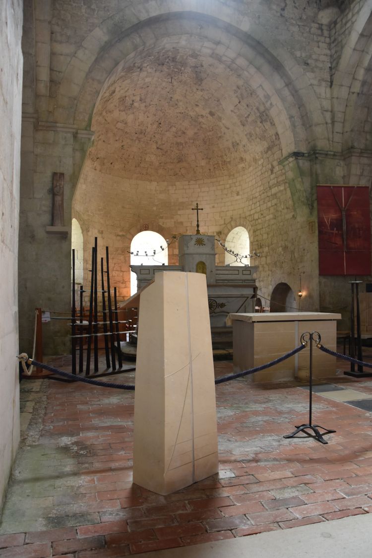 In front there is a modern ambo that has been selected with care. A panel explains that the stone comes from Tavel. Engraved is a curved cross, giving it a dynamic aspect.