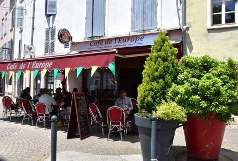 We continue driving north and have our last lunch stop in Voiron (Département Isère). The Rossignol skis are produced in Voiron, as I learn. We have a light meal – salad with fish – in the Café de l’Europe. The friendly servant says that the manager speaks German and does not like to write menu cards – that is why they do not have any… and indeed, the manager comes from the Black Forest and has lived here in France for many years.