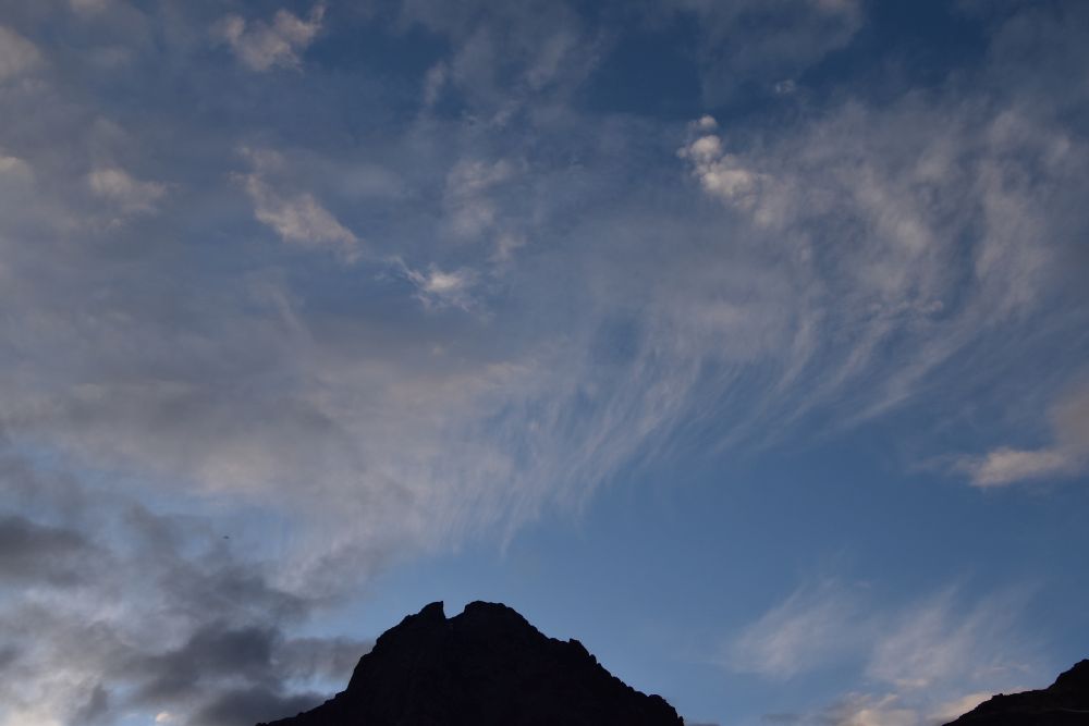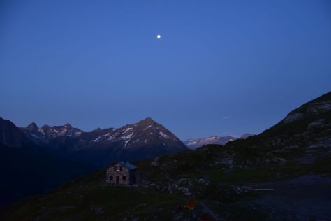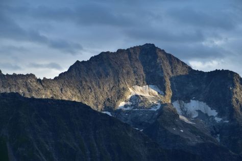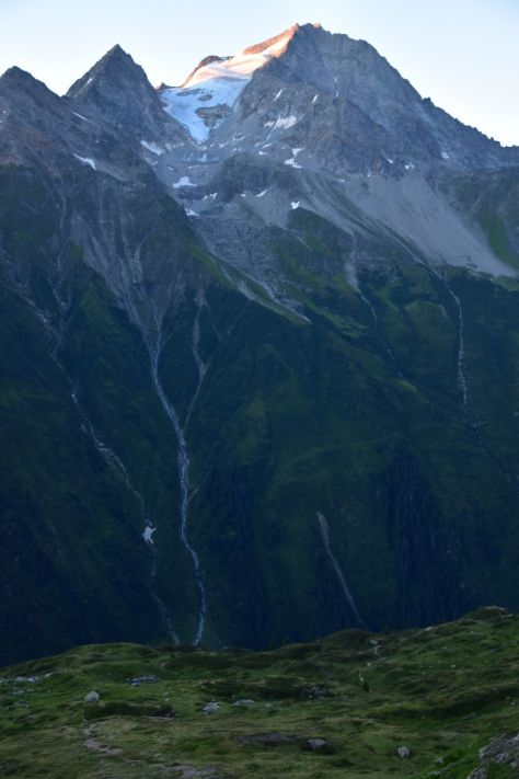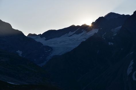 The sun takes its time and I feel cold. Shortly after seven o’clock, the sun appears above the glacier Hüfi Firn, just for a moment, disappears again and reappears in the next gap of the rock to accompany us for the rest of the day.