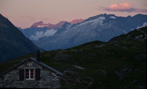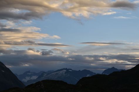 Some red clouds in the west have appeared above what I think is the Susten. The Galenstock shines fully in the sun.