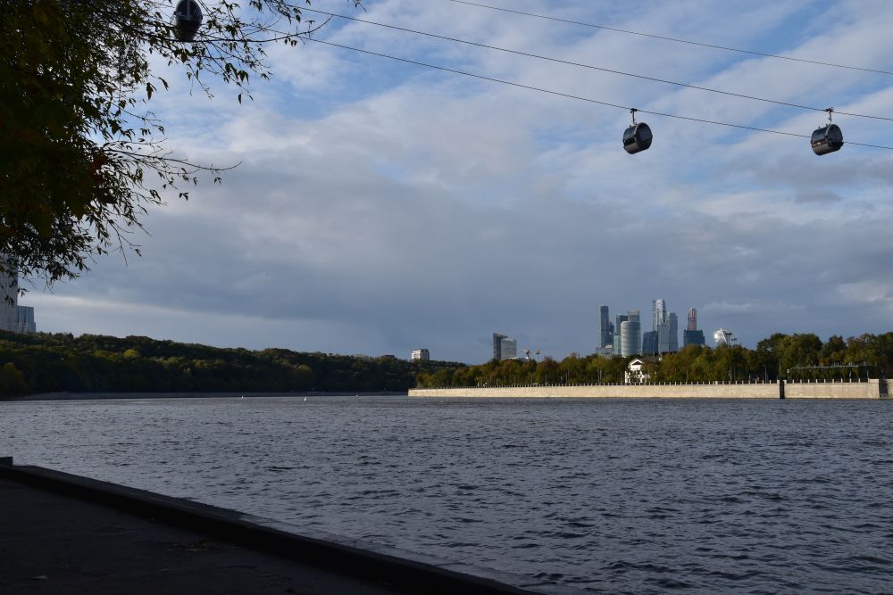 We walk down through the forest to the river Moskva. There would have been a cable car to bring us up and down. In the background we can see the modern Moscow city…