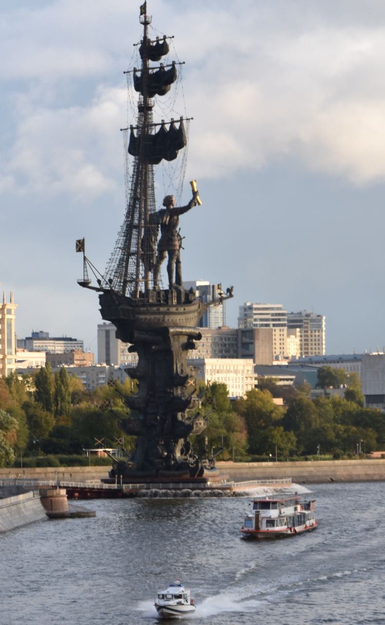 … the 98m tall Peter the Great monument (1997), which seems somewhat odd to me with the sails that look a bit like hanging laundry. Peter the Great had learnt shipbuilding in the Netherlands and I am not sure, whether he would have installed such sails that may not really be useful for sailing. Actually rumors tell us that Tsereteli first called his monument Columbus and intended to give to the US. The US refused the gift. The rumors continue that then Tsereteli redefined his monument as “Peter the Great” with the intention to place it at Saint Petersburg. But they did not want the statue either. Finally Tsereteli’s Peter the Great found his place not far from the Savior Cathedral.
