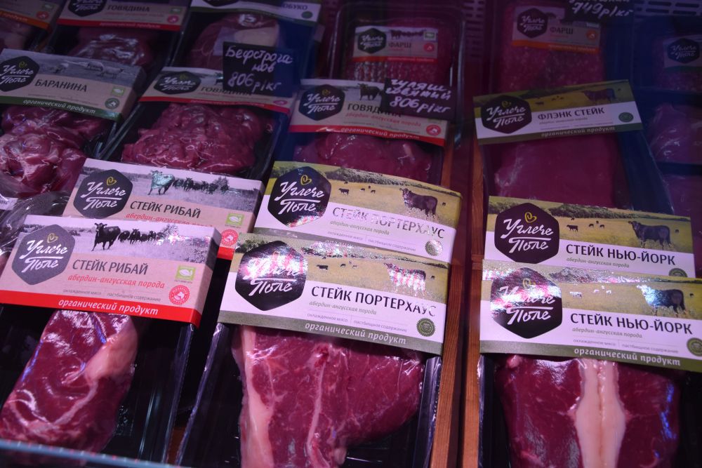 Now we are at a meat stand. “Стейк”, spelled out “steik”, is “steak”. And we can buy several steaks: рибай (riba-y) is rib-eye, Нью-Йорк (Nyu-York) is New York; and Портерхаус (porter-kh-aus) is porterhouse (the Russian do not have the “h” and replace it by their “х” (“kh” like “Loch Ness” or “Buch“).