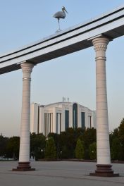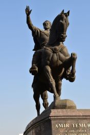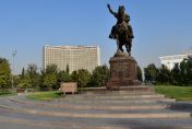 The Hotel Uzbekistan is located at the spacious Amir Timur Square, and Timur rides a horse here.