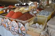 Uzbekans are multi-lingual. This round box contains a selection of spices, and they are labeled in Russian (набор) and in English (mixed). Each of the spices has two names on the label, the Russian and the English one.